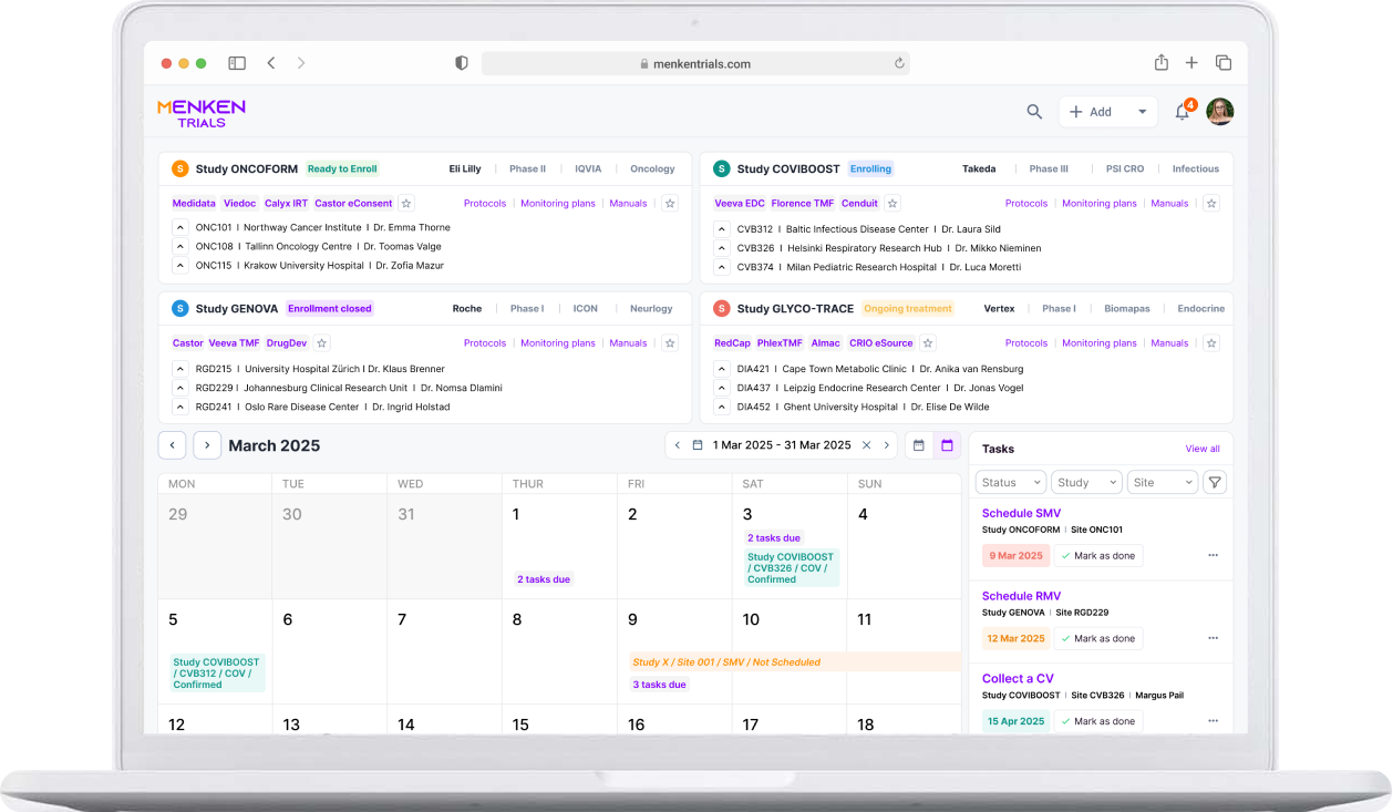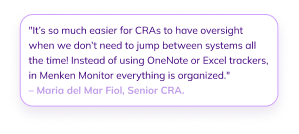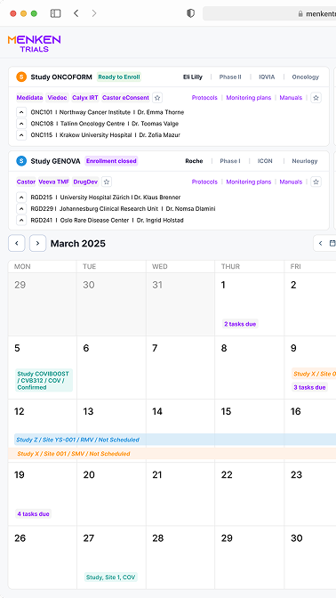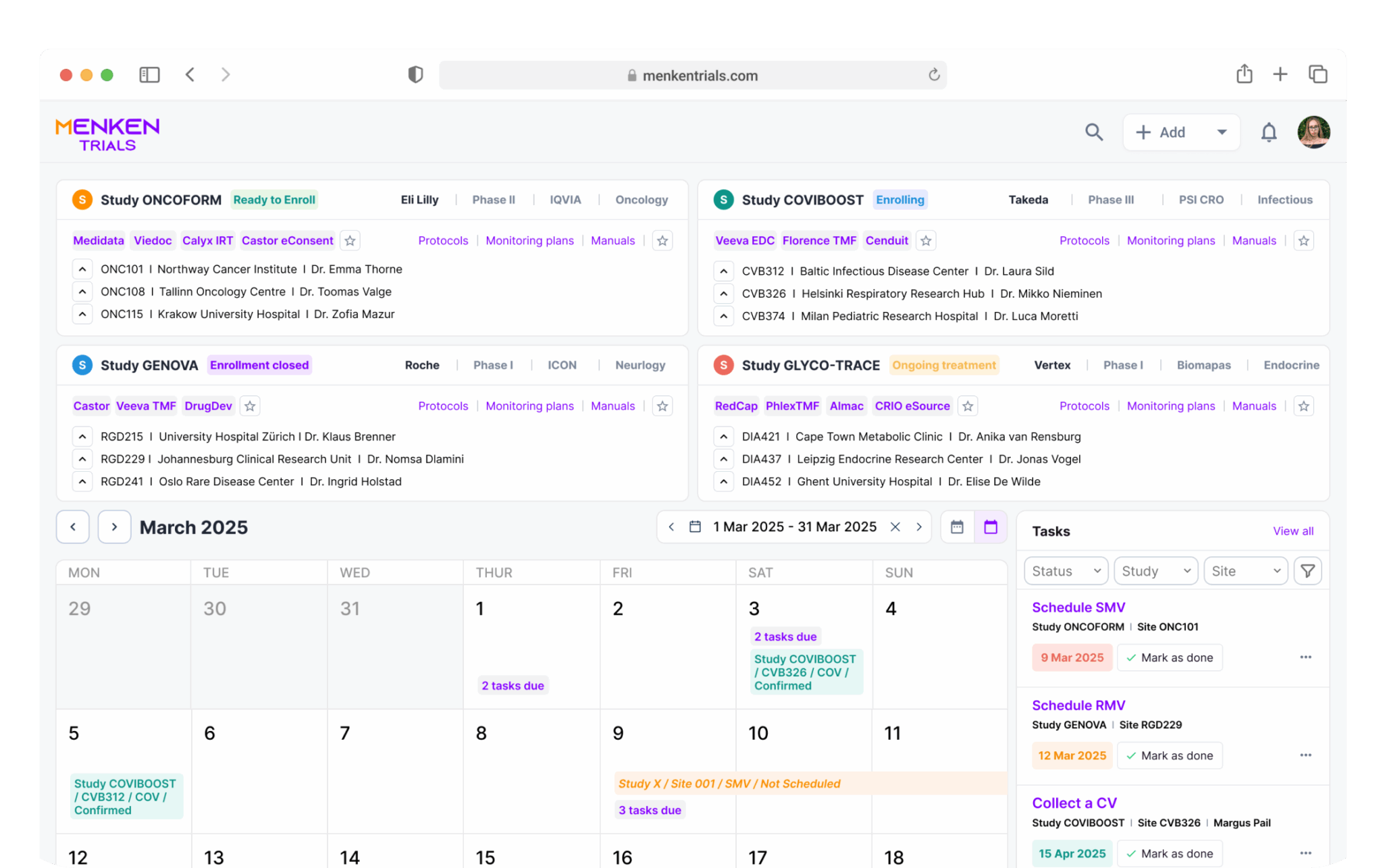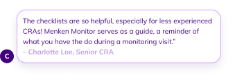 Smart checklists, visit templates, and trackers help you plan, execute, and document every visit confidently. Whether you’re preparing for a Routine Monitoring Visit or following up after a Close-Out, Menken Monitor guides you throughout the process.