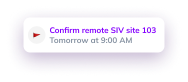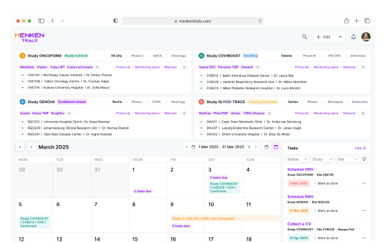 Built-in dashboards show the full status of your clinical trials: from study overview to site status, missing documentation, upcoming monitoring visits and open action items. Easily check what’s overdue, and what needs your attention — all in one place.